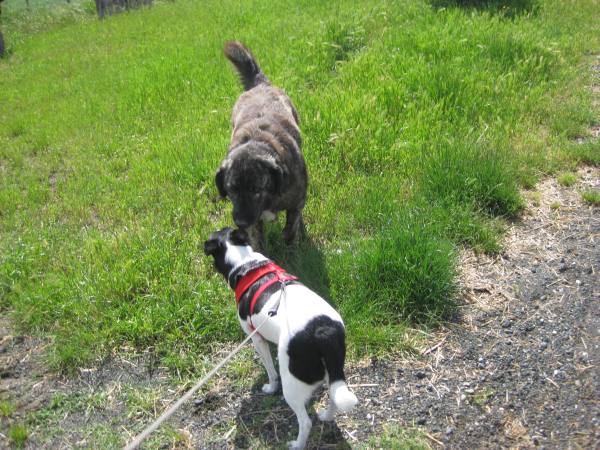 Nr. 012: Habe doch noch ein Foto mit Perelka vom Urlaub in Italien gefunden. Auf dem Bauernhof neben unserer Unterkunft war der grosse Hund und noch eine genausogrosse weisse Hündin. Perelka ist mit anderen Hunden absolut verträglich uns sehr sozial.