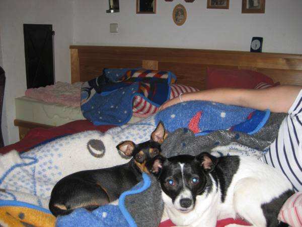 Perelka hat sich wirklich gut eingelebt. Wenn mein Mann oder Luzie von der Arbeit nach Hause kommen schreit Missi ganz laut und wenn ich die Tür aufmache, sausen Perelka und Missi zur Begrüssung los. Mit dem Kater Rolle liegen beide auch absolut friedlich auf dem Sofa. Wenn er aber schneller geht, sind sich beide Mädels einig: Er wird angebellt und gejagt. Mit der zweiten Katze Biene haben beide Hunde praktisch keinen Kontakt, weil sie eine Einzelgängerin ist und Hunde nicht mag. Biene habe ich von einer verstorbenen Arbeitskollegin übernommen und da war sie Einzelkatze. Mein Sohn Niki und meine Tochter Priska sind Perelka noch unheimlich, obwohl sich beide Mühe geben. Perelka bellt dann und versucht entweder zu flüchten oder unter eine Decke zu schlüpfen. Wahrscheinlich hat Perelka schlechte Erfahrungen mit Jugendlichen gemacht? Aber schliesslich ist Perelka ja auch erst 3 Monate bei uns und das wird schon noch. Nach wie vor mag sich Perelka auch nicht gerne fassen oder fangen lassen, vor allem im Freien. Ich lasse dann einfach eine Tür offen und Perelka saust ein paarmal ums Haus, guckt vorsichtig ob die offene Tür eine Falle sein könnte und kommt dann irgendwann herein. Sie läuft aber nicht fort und bleibt ganz in der Nähe. Beim Gassigehen ist Perelka nicht mehr die schüchterne, vernünftige Mutter, sondern wird richtig übermütig. Wenn man "Gassi " sagt, springt sie an einem hoch und wedelt mit dem Schwanz. Sie pfeift dann auch richtig. Beim Gassigehen sind beide Hunde durch die Siedlung angeleint, dürfen dann aber frei laufen. Es ist immer lustig den beiden zuzuschauen, wenn sie z.B. fast zusammenstossen oder einen Überschlag machen, weil sie sich im langen Gras verheddert haben. Es ist immer schön zu sehen, wieviel Freude die Hunde am Leben haben und auch wie viel Freude sie machen. Mauseloch aufbuddeln mögen auch beide. Mein Mann hat die beiden mit dem Handy gefilmt; der Film kann aber mit e-mail nicht verschickt werden, weil er zu viele Daten enthält. Mein Sohn wird versuchen, das ganze zu komprimieren und kürzen. Vielleicht kriegt er es hin, dass ich Ihnen den Film mailen kann.