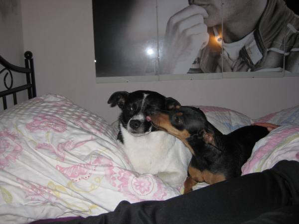 Nr. 038: Missi schleckt Perelka mit Vorliebe Augen und Ohren. Manchmal tut mir Perelka da fast leid, aber ich hoffe dass sie sich melden würde, wenn es ihr nicht passt. Die beiden fressen auch aus einem Napf, obwohl Missi eigentlich einen extra Fressplatz hatte. Sie haben sich auch beim Fressen noch kein einziges Mal angeknurrt.