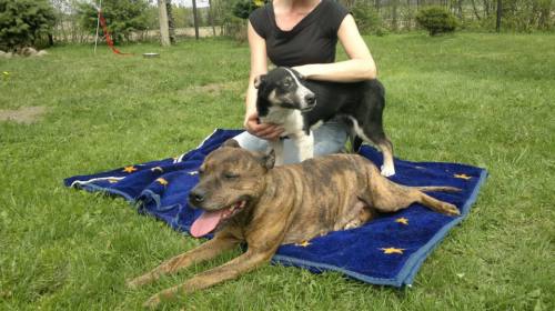 Und am Ende möchte ich Euch ein paar Bilder von unseren Cesare ( Patentante Fr. Jana Kammer) zeigen. Cesare, war der junge Hund, eigentlich ein Welpchen, der beim toben mit seinem Geschwistern, so unglücklich sein Beinchen gebrochen hat, das eine mehrstündige OP nötig war. Durch Geldspenden von unseren lieben Freunden aus Facebook und Hilfe von der lieber Patentante, könnten wir die OP Kosten bezahlen. Jetzt lebt der kleiner ( gar nicht mehr so kleiner ) in eine liebe Pflegefamilie, nicht weit von Pusia, wo er von eine ältere Stafford Hündin " adoptiert" wurde und die ihm das hündische ABC zeigt. Und der kann so toll rennen, das niemand glauben kann, das er noch vor kurzem so behindert war. Hier danke ich noch mal unsere liebe Fr. Dr. Ossowska, die die OP meissterhaft durchgeführt hat und wie immer, einem von unseren Hunden geholfen hat. Auch den lieben Pflegemamis - Ania und Emilia, danke ich sehr, das die sich so gut um den kleinen kümmern. Hoffentlich finden wir bald ein schönes Zuhause in Deutschland für den lieben Cesare.